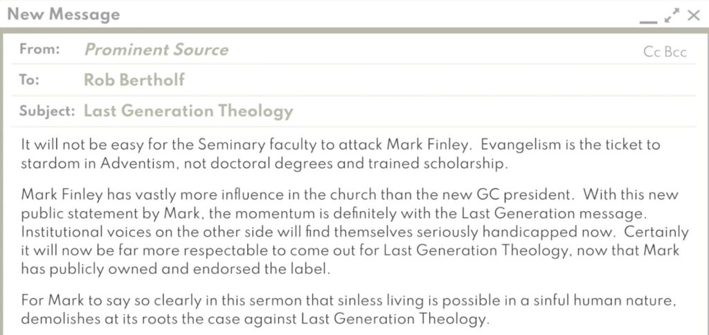 Embora Finley tenha tratado de santidade, obediência e santificação ao longo de toda a sua carreira, este novo sermão foi publicado às vésperas da convenção anual do movimento Geração. Juventude. Cristo. (GYC), que será realizada nos EUA daqui a três semanas. A convenção da filial brasileira está agendada para os dias 18-21 de dezembro. Ted Wilson está responsável pelo sermão de sábado no evento estadunidense.