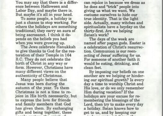 Por fim, o Andrews University Cardinal de 1984-1985 também trazia uma página sobre a festa de Halloween, com fotos de estudantes fantasiados sob o título “Party Time Halloween”. O texto refletia: “O Halloween — embora baseado em rituais pagãos — ainda oferece uma chance para a criatividade cristã brilhar. Vamos festejar.”16