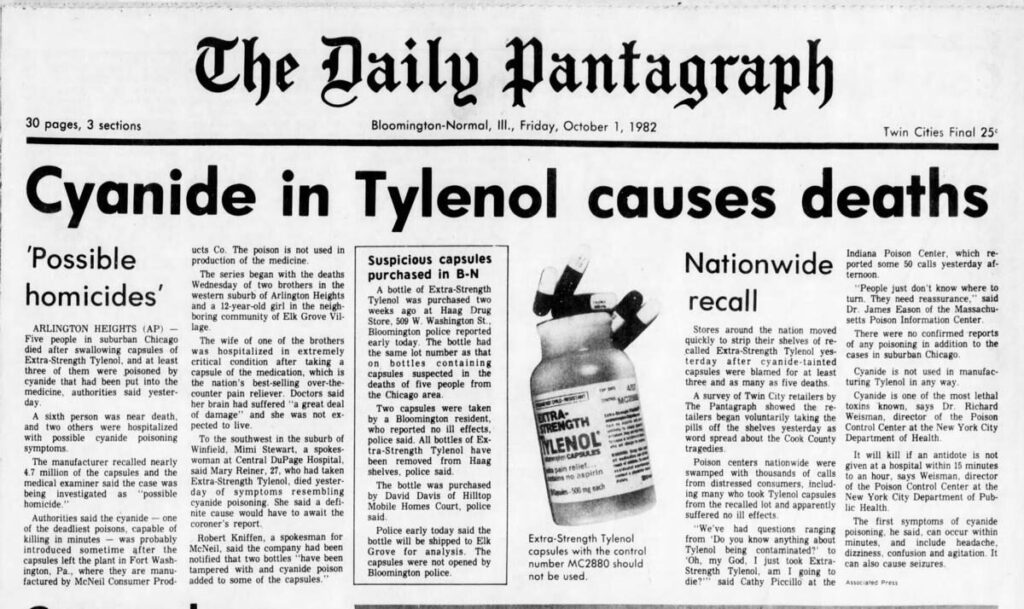 Então chegou 1982, com os “assassinatos do Tylenol em Chicago”. Os assassinatos, resultado da descoberta de cianeto em frascos de Tylenol adulterados, foram notícia de primeira página em 1º de outubro daquele ano. Juntamente com dois atos de sadismo de Halloween já bem conhecidos — um deles uma brincadeira mal concebida por uma dona de casa e outro por um pai tentando receber o seguro de vida18 — essas realidades consolidaram o tropo de planos nefastos contra crianças associados ao feriado.