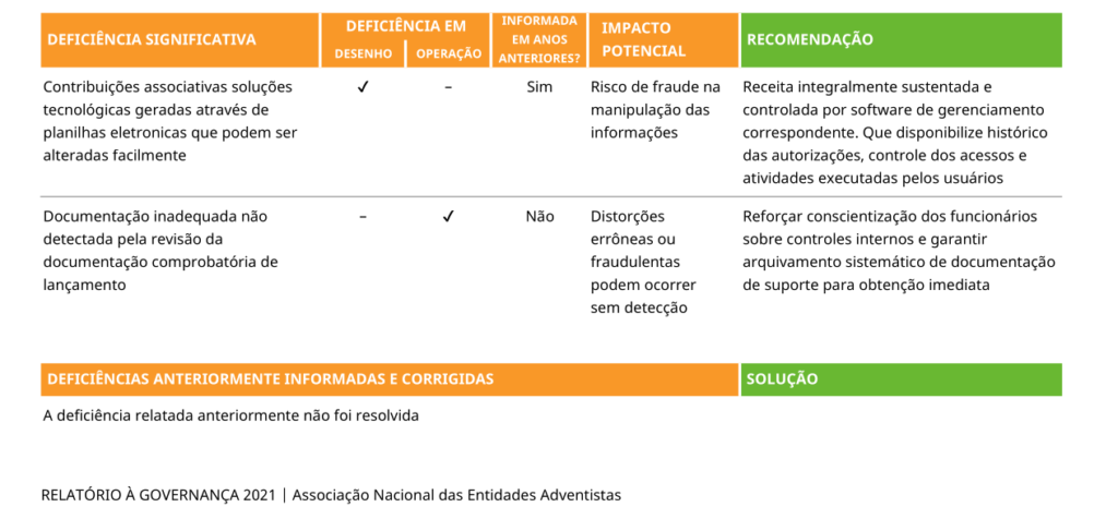 Screenshot do relatório de 2021 do GCAS para a Associação Nacional de Entidades Adventistas, afirmando que havia deficiências significativas no controle interno da organização.