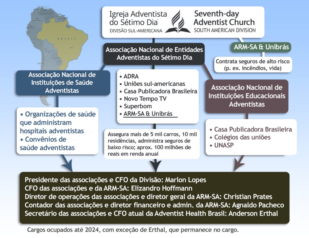 Lopes e o secretário das associações, Anderson Erthal, que é atualmente o CFO da Adventist Health Brasil, lideravam os conselhos das associações, mas não conduziam as operações diretamente. Reportagens anteriores da Zelota citaram uma pessoa da ARM descrevendo essas organizações como uma “experiência de entidades que recebem recursos de contribuintes”, dirigida pela DSA. Enquanto a ARM-SA mediava a contratação de seguros de alto risco com seguradoras externas, a maior parte dos carros, dispositivos eletrônicos e residências sob administração da DSA era assegurada diretamente pelas três associações.
